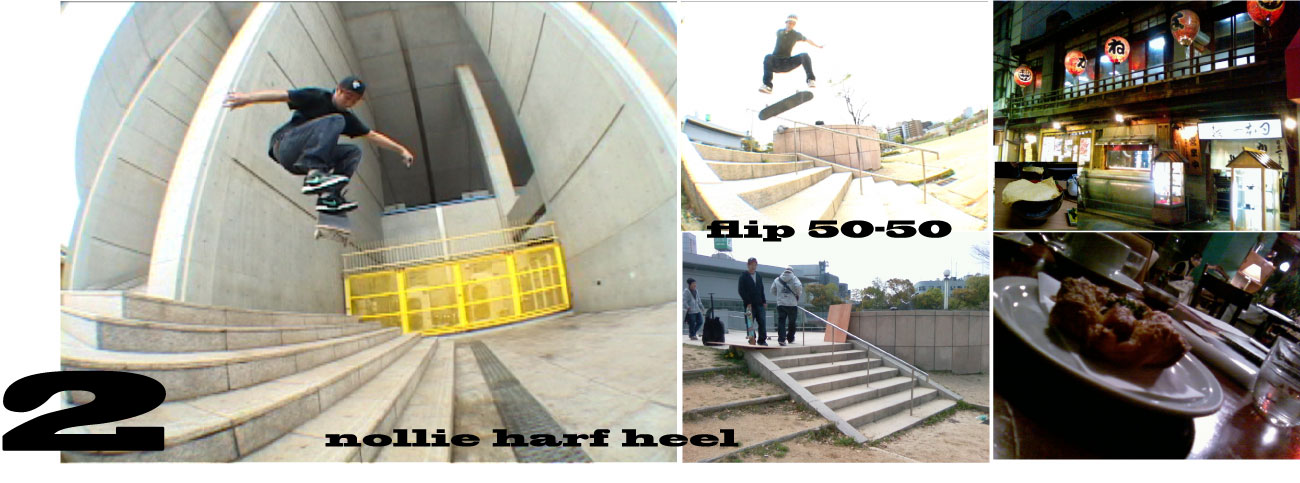 次のspotは、yoheyy君のローカルspotの長居公園。サントスもこの近くに引っ越してきたらしい。なっがいカーブと上と下にイボイボがついた6段ステア。ここでもサントスと、ケイ君が撮れました。コウちゃんは、鬼グリ。。。ついてないな。。。。ラインも撮りたがったんですが、雨とみんなの集中力切れで断念。。また次回ってことで。で、雨も結構ふってきたので、サントスとかと解散し彼女が先に京都に行ってたので、急いで京都へ。夕飯は、烏丸小池らへんにある(かねよ)とゆ〜お店。うな丼の上に厚焼きタマゴが乗っかってて、馬!! そのあと カフェコチにいき、のんびり雑誌読んだり、いい時間を過ごしました。